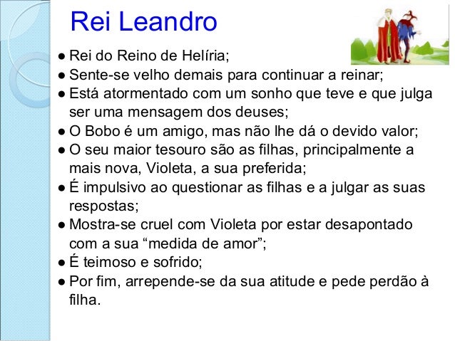 2. 2. Rei Leandro● Rei do Reino de Helíria;● Sente-se velho demais para continuar a reinar;● Está atormentado com um sonho que teve e que julga ser uma mensagem dos deuses;● O Bobo é um amigo, mas não lhe dá o devido valor;● O seu maior tesouro são as filhas, principalmente a mais nova, Violeta, a sua preferida;● É impulsivo ao questionar as filhas e a julgar as suas respostas;● Mostra-se cruel com Violeta por estar desapontado com a sua “medida de amor”;● É teimoso e sofrido;● Por fim, arrepende-se da sua atitude e pede perdão à filha.