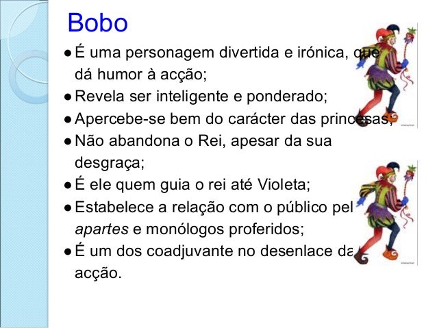 3. 3. Bobo● É uma personagem divertida e irónica, que dá humor à acção;● Revela ser inteligente e ponderado;● Apercebe-se bem do carácter das princesas;● Não abandona o Rei, apesar da sua desgraça;● É ele quem guia o rei até Violeta;● Estabelece a relação com o público pelos apartes e monólogos proferidos;● É um dos coadjuvante no desenlace da acção.