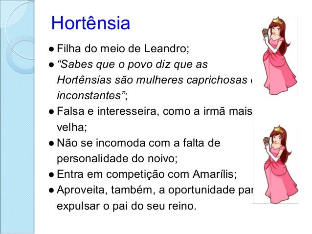 5. 5. Hortênsia● Filha do meio de Leandro;● “Sabes que o povo diz que as Hortênsias são mulheres caprichosas e inconstantes”;● Falsa e interesseira, como a irmã mais velha;● Não se incomoda com a falta de personalidade do noivo;● Entra em competição com Amarílis;● Aproveita, também, a oportunidade para expulsar o pai do seu reino.