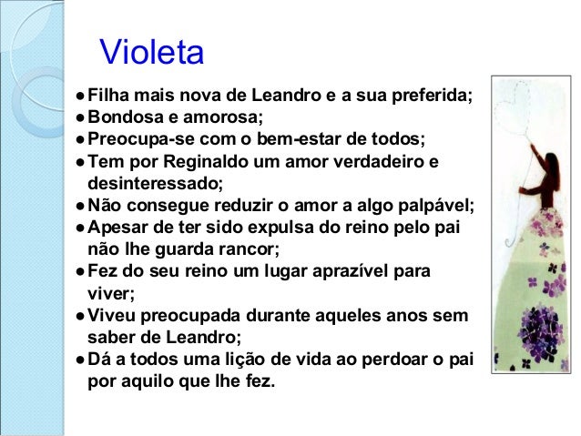 6. 6. Violeta● Filha mais nova de Leandro e a sua preferida;● Bondosa e amorosa;● Preocupa-se com o bem-estar de todos;● Tem por Reginaldo um amor verdadeiro e desinteressado;● Não consegue reduzir o amor a algo palpável;● Apesar de ter sido expulsa do reino pelo pai não lhe guarda rancor;● Fez do seu reino um lugar aprazível para viver;● Viveu preocupada durante aqueles anos sem saber de Leandro;● Dá a todos uma lição de vida ao perdoar o pai por aquilo que lhe fez.
