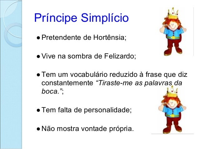 Príncipe Simplício● Pretendente de Hortênsia;● Vive na sombra de Felizardo;● Tem um vocabulário reduzido à frase que diz  ...