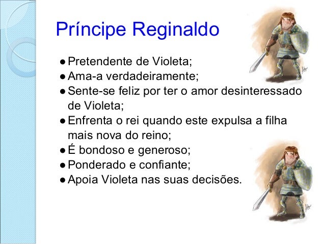9. 9. Príncipe Reginaldo● Pretendente de Violeta;● Ama-a verdadeiramente;● Sente-se feliz por ter o amor desinteressado de Violeta;● Enfrenta o rei quando este expulsa a filha mais nova do reino;● É bondoso e generoso;● Ponderado e confiante;● Apoia Violeta nas suas decisões.