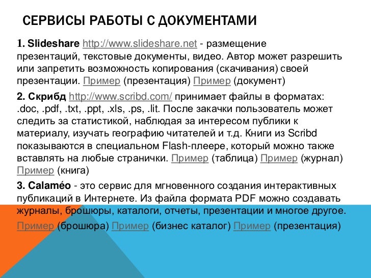 10. 10. СЕРВИСЫ РАБОТЫ С ДОКУМЕНТАМИ 1. Slideshare http://www.slideshare.net - размещение презентаций, текстовые документы, видео. Автор может разрешить или запретить возможность копирования (скачивания) своей презентации. Пример (презентация) Пример (документ) 2. Скрибд http://www.scribd.com/ принимает файлы в форматах: .doc, .pdf, .txt, .ppt, .xls, .ps, .lit. После закачки пользователь может следить за статистикой, наблюдая за интересом публики к материалу, изучать географию читателей и т.д. Книги из Scribd показываются в специальном Flash-плеере, который можно также вставлять на любые странички. Пример (таблица) Пример (журнал) Пример (книга) 3. Calaméo - это сервис для мгновенного создания интерактивных публикаций в Интернете. Из файла формата PDF можно создавать журналы, брошюры, каталоги, отчеты, презентации и многое другое. Пример (брошюра) Пример (бизнес каталог) Пример (презентация)