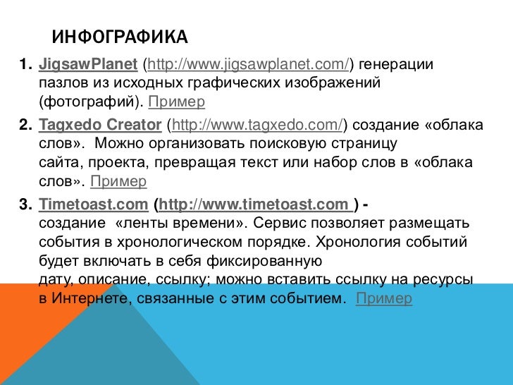 11. 11. ИНФОГРАФИКА 1. JigsawPlanet (http://www.jigsawplanet.com/) генерации пазлов из исходных графических изображений (фотографий). Пример 2. Tagxedo Creator (http://www.tagxedo.com/) создание «облака слов». Можно организовать поисковую страницу сайта, проекта, превращая текст или набор слов в «облака слов». Пример 3. Timetoast.com (http://www.timetoast.com ) - создание «ленты времени». Сервис позволяет размещать события в хронологическом порядке. Хронология событий будет включать в себя фиксированную дату, описание, ссылку; можно вставить ссылку на ресурсы в Интернете, связанные с этим событием. Пример