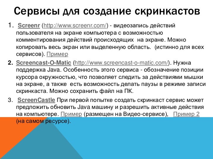 12. 12. Сервисы для создание скринкастов 1. Screenr (http://www.screenr.com/) - видеозапись действий пользователя на экране компьютера с возможностью комментирования действий происходящих на экране. Можно копировать весь экран или выделенную область. (истинно для всех сервисов). Пример 2. Screencast-O-Matic (http://www.screencast-o-matic.com/). Нужна поддержка Java. Особенность этого сервиса - обозначение позиции курсора окружностью, что позволяет следить за действиями мышки на экране, а также есть возможность делать паузы в режиме записи скринкаста. Можно сохранить файл на ПК. 3. ScreenCastle При первой попытке создать скринкаст сервис может предложить обновить Java машину и разрешить активные действия на компьютере. Пример (размещен на Видео-сервисе), Пример 2 (на самом ресурсе).