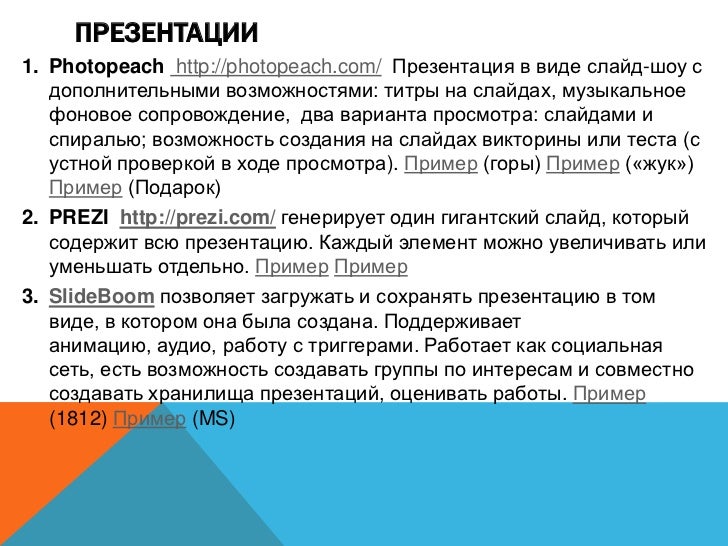 13. 13. ПРЕЗЕНТАЦИИ 1. Photopeach http://photopeach.com/ Презентация в виде слайд-шоу с дополнительными возможностями: титры на слайдах, музыкальное фоновое сопровождение, два варианта просмотра: слайдами и спиралью; возможность создания на слайдах викторины или теста (с устной проверкой в ходе просмотра). Пример (горы) Пример («жук») Пример (Подарок) 2. PREZI http://prezi.com/ генерирует один гигантский слайд, который содержит всю презентацию. Каждый элемент можно увеличивать или уменьшать отдельно. Пример Пример 3. SlideBoom позволяет загружать и сохранять презентацию в том виде, в котором она была создана. Поддерживает анимацию, аудио, работу с триггерами. Работает как социальная сеть, есть возможность создавать группы по интересам и совместно создавать хранилища презентаций, оценивать работы. Пример (1812) Пример (MS)