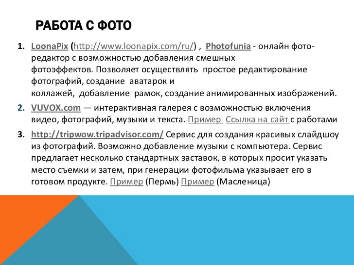 14. 14. РАБОТА С ФОТО 1. LoonaPix (http://www.loonapix.com/ru/) , Photofunia - онлайн фото- редактор с возможностью добавления смешных фотоэффектов. Позволяет осуществлять простое редактирование фотографий, создание аватарок и коллажей, добавление рамок, создание анимированных изображений. 2. VUVOX.com — интерактивная галерея с возможностью включения видео, фотографий, музыки и текста. Пример Ссылка на сайт с работами 3. http://tripwow.tripadvisor.com/ Сервис для создания красивых слайдшоу из фотографий. Возможно добавление музыки с компьютера. Сервис предлагает несколько стандартных заставок, в которых просит указать место съемки и затем, при генерации фотофильма указывает его в готовом продукте. Пример (Пермь) Пример (Масленица)
