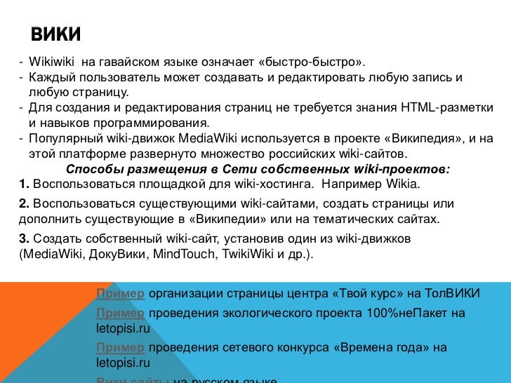 15. 15. ВИКИ - Wikiwiki на гавайском языке означает «быстро-быстро». - Каждый пользователь может создавать и редактировать любую запись и любую страницу. - Для создания и редактирования страниц не требуется знания HTML-разметки и навыков программирования. - Популярный wiki-движок MediaWiki используется в проекте «Википедия», и на этой платформе развернуто множество российских wiki-сайтов. Способы размещения в Cети собственных wiki-проектов: 1. Воспользоваться площадкой для wiki-хостинга. Например Wikia. 2. Воспользоваться существующими wiki-сайтами, создать страницы или дополнить существующие в «Википедии» или на тематических сайтах. 3. Создать собственный wiki-сайт, установив один из wiki-движков (MediaWiki, ДокуВики, MindTouch, TwikiWiki и др.). Пример организации страницы центра «Твой курс» на ТолВИКИ Пример проведения экологического проекта 100%неПакет на letopisi.ru Пример проведения сетевого конкурса «Времена года» на letopisi.ru