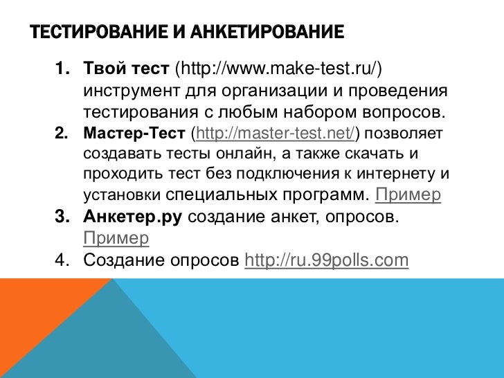 16. 16. ТЕСТИРОВАНИЕ И АНКЕТИРОВАНИЕ 1. Твой тест (http://www.make-test.ru/) инструмент для организации и проведения тестирования с любым набором вопросов. 2. Мастер-Тест (http://master-test.net/) позволяет создавать тесты онлайн, а также скачать и проходить тест без подключения к интернету и установки специальных программ. Пример 3. Анкетер.ру создание анкет, опросов. Пример 4. Создание опросов http://ru.99polls.com