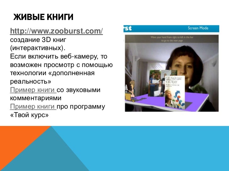 17. 17. ЖИВЫЕ КНИГИ http://www.zooburst.com/ создание 3D книг (интерактивных). Если включить веб-камеру, то возможен просмотр с помощью технологии «дополненная реальность» Пример книги со звуковыми комментариями Пример книги про программу «Твой курс»
