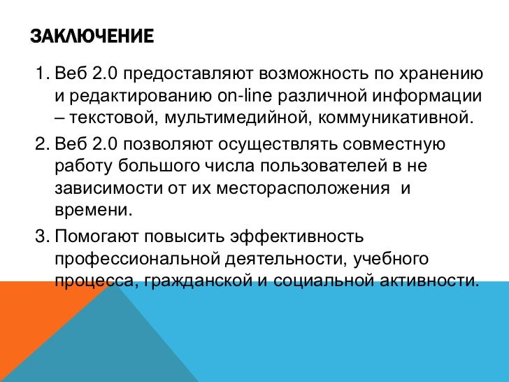 18. 18. ЗАКЛЮЧЕНИЕ 1. Веб 2.0 предоставляют возможность по хранению и редактированию on-line различной информации – текстовой, мультимедийной, коммуникативной. 2. Веб 2.0 позволяют осуществлять совместную работу большого числа пользователей в не зависимости от их месторасположения и времени. 3. Помогают повысить эффективность профессиональной деятельности, учебного процесса, гражданской и социальной активности.