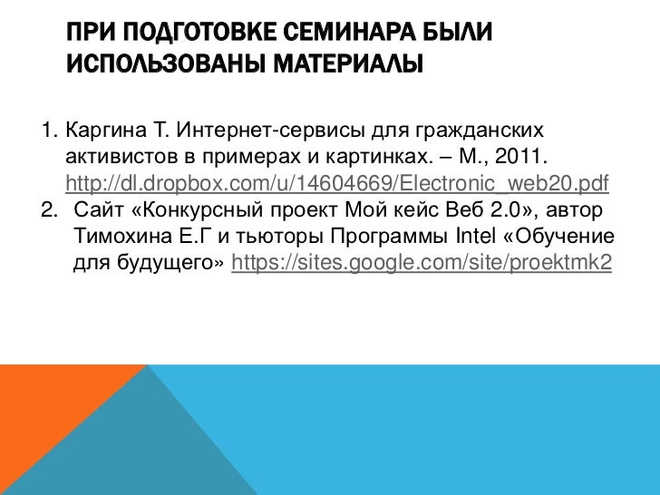 19. 19. ПРИ ПОДГОТОВКЕ СЕМИНАРА БЫЛИ ИСПОЛЬЗОВАНЫ МАТЕРИАЛЫ 1. Каргина Т. Интернет-сервисы для гражданских активистов в примерах и картинках. – М., 2011. http://dl.dropbox.com/u/14604669/Electronic_web20.pdf 2. Сайт «Конкурсный проект Мой кейс Веб 2.0», автор Тимохина Е.Г и тьюторы Программы Intel «Обучение для будущего» https://sites.google.com/site/proektmk2