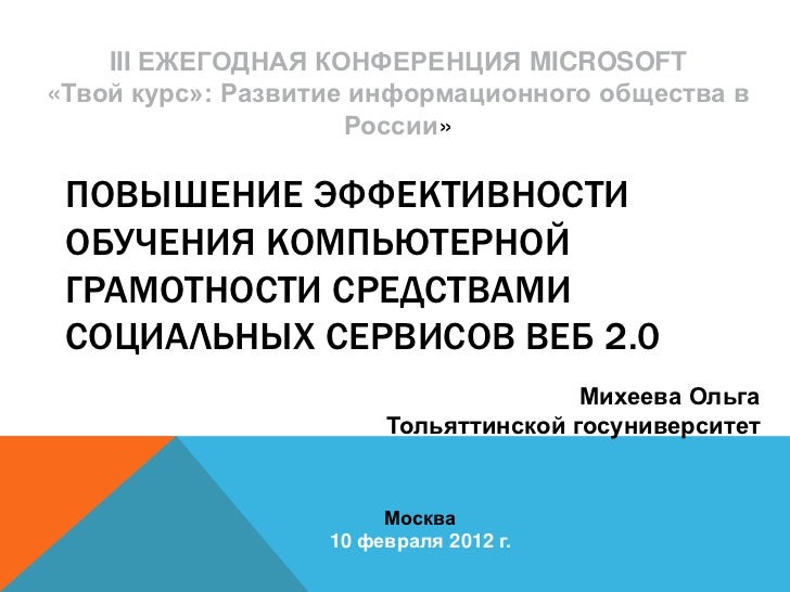 2. 2. III ЕЖЕГОДНАЯ КОНФЕРЕНЦИЯ MICROSOFT «Твой курс»: Развитие информационного общества в России» ПОВЫШЕНИЕ ЭФФЕКТИВНОСТИ ОБУЧЕНИЯ КОМПЬЮТЕРНОЙ ГРАМОТНОСТИ СРЕДСТВАМИ СОЦИАЛЬНЫХ СЕРВИСОВ ВЕБ 2.0 Михеева Ольга Тольяттинской госуниверситет Москва 10 февраля 2012 г.