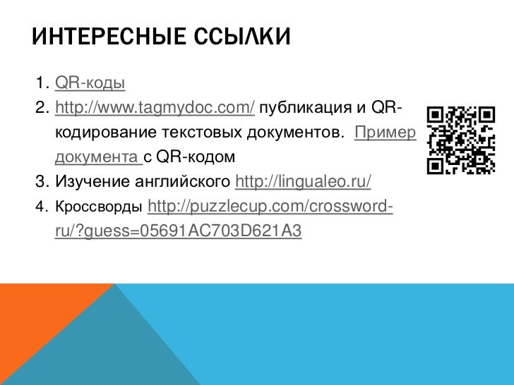 8. 8. ИНТЕРЕСНЫЕ ССЫЛКИ 1. QR-коды 2. http://www.tagmydoc.com/ публикация и QR- кодирование текстовых документов. Пример документа с QR-кодом 3. Изучение английского http://lingualeo.ru/ 4. Кроссворды http://puzzlecup.com/crossword- ru/?guess=05691AC703D621A3