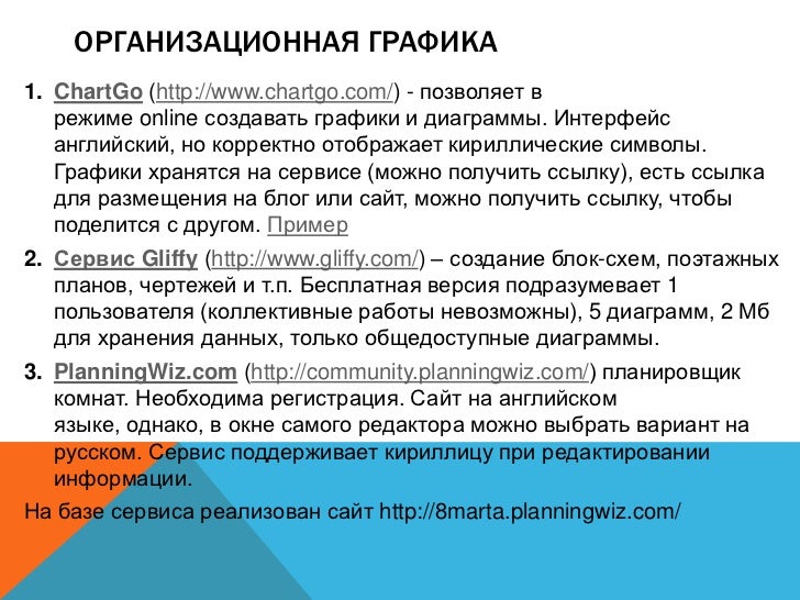 9. 9. ОРГАНИЗАЦИОННАЯ ГРАФИКА 1. ChartGo (http://www.chartgo.com/) - позволяет в режиме online создавать графики и диаграммы. Интерфейс английский, но корректно отображает кириллические символы. Графики хранятся на сервисе (можно получить ссылку), есть ссылка для размещения на блог или сайт, можно получить ссылку, чтобы поделится с другом. Пример 2. Сервис Gliffy (http://www.gliffy.com/) – создание блок-схем, поэтажных планов, чертежей и т.п. Бесплатная версия подразумевает 1 пользователя (коллективные работы невозможны), 5 диаграмм, 2 Мб для хранения данных, только общедоступные диаграммы. 3. PlanningWiz.com (http://community.planningwiz.com/) планировщик комнат. Необходима регистрация. Сайт на английском языке, однако, в окне самого редактора можно выбрать вариант на русском. Сервис поддерживает кириллицу при редактировании информации. На базе сервиса реализован сайт http://8marta.planningwiz.com/