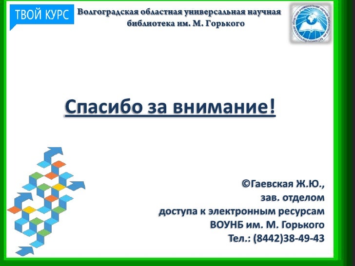 16. 16. Спасибо за внимание! ©Гаевская Ж.Ю., зав. отделом доступа к электронным ресурсам ВОУНБ им. М. Горького Тел.: (8442)38-49-43