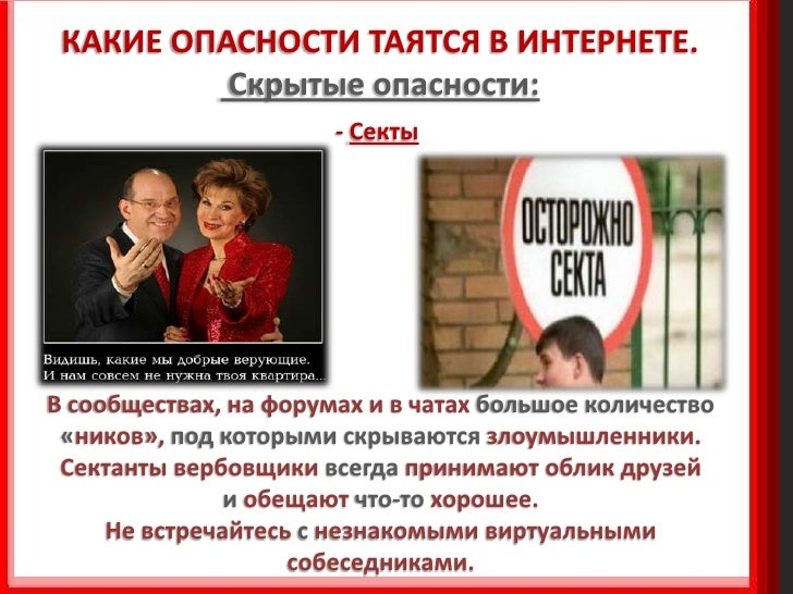5. 5. КАКИЕ ОПАСНОСТИ ТАЯТСЯ В ИНТЕРНЕТЕ. Скрытые опасности: - Секты В сообществах, на форумах и в чатах большое количество «ников», под которыми скрываются злоумышленники. Сектанты вербовщики всегда принимают облик друзей и обещают что-то хорошее. Не встречайтесь с незнакомыми виртуальными собеседниками.