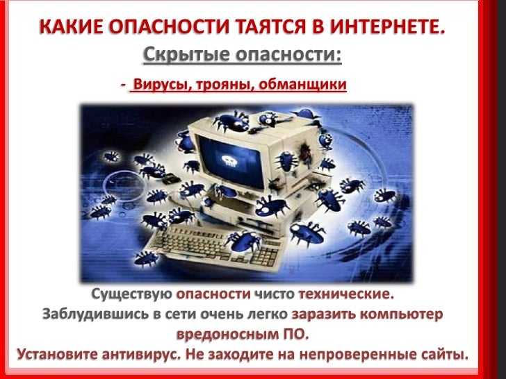 6. 6. КАКИЕ ОПАСНОСТИ ТАЯТСЯ В ИНТЕРНЕТЕ. Скрытые опасности: - Вирусы, трояны, обманщики Существую опасности чисто технические. Заблудившись в сети очень легко заразить компьютер вредоносным ПО. Установите антивирус. Не заходите на непроверенные сайты.