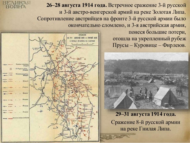 11. 11. 26–28 августа 1914 года. Встречное сражение 3-й русской и 3-й австро-венгерской армий на реке Золотая Липа. Сопротивление австрийцев на фронте 3-й русской армии было окончательно сломлено, и 3-я австрийская армия, понеся большие потери, отошла на укрепленный рубеж Прусы – Куровице – Фирлеюв. 29–31 августа 1914 года. Сражение 8-й русской армии на реке Гнилая Липа.