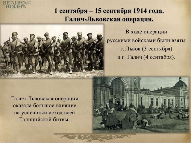 13. 13. 1 сентября – 15 сентября 1914 года. Галич-Львовская операция. В ходе операции русскими войсками были взяты г. Львов (3 сентября) и г. Галич (4 сентября). Галич-Львовская операция оказала большое влияние на успешный исход всей Галицийской битвы.