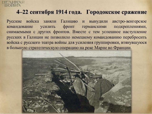 14. 14. 4–22 сентября 1914 года. Городокское сражение Русские войска заняли Галицию и вынудили австро-венгерское командование усилить фронт германскими подкреплениями, снимаемыми с других фронтов. Вместе с тем успешное наступление русских в Галиции не позволило немецкому командованию перебросить войска с русского театра войны для усиления группировки, втянувшуюся в большую стратегическую операцию на реке Марне во Франции.