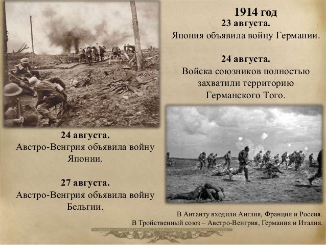 16. 16. 23 августа. Япония объявила войну Германии. 24 августа. Войска союзников полностью захватили территорию Германского Того. 24 августа. Австро-Венгрия объявила войну Японии. 27 августа. Австро-Венгрия объявила войну Бельгии. 1914 год В Антанту входили Англия, Франция и Россия. В Тройственный союз – Австро-Венгрия, Германия и Италия.