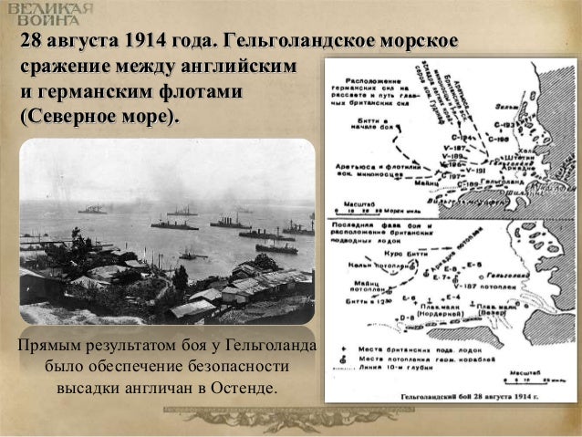 17. 17. 28 августа 1914 года. Гельголандское морское сражение между английским и германским флотами (Северное море). Прямым результатом боя у Гельголанда было обеспечение безопасности высадки англичан в Остенде.