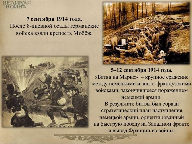 18. 18. 7 сентября 1914 года. После 8-дневной осады германские войска взяли крепость Мобёж. 5–12 сентября 1914 года. «Битва на Марне» – крупное сражение между немецкими и англо-французскими войсками, закончившееся поражением немецкой армии. В результате битвы был сорван стратегический план наступления немецкой армии, ориентированный на быструю победу на Западном фронте и вывод Франции из войны.