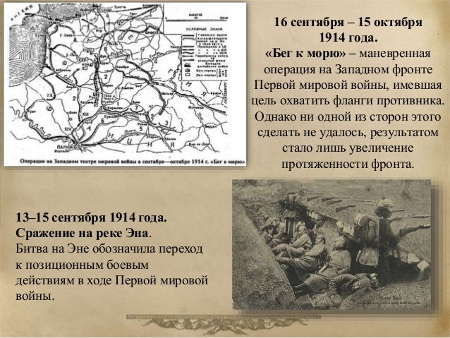 19. 19. 16 сентября – 15 октября 1914 года. «Бег к морю» – маневренная операция на Западном фронте Первой мировой войны, имевшая цель охватить фланги противника. Однако ни одной из сторон этого сделать не удалось, результатом стало лишь увеличение протяженности фронта. 13–15 сентября 1914 года. Сражение на реке Эна. Битва на Эне обозначила переход к позиционным боевым действиям в ходе Первой мировой войны.
