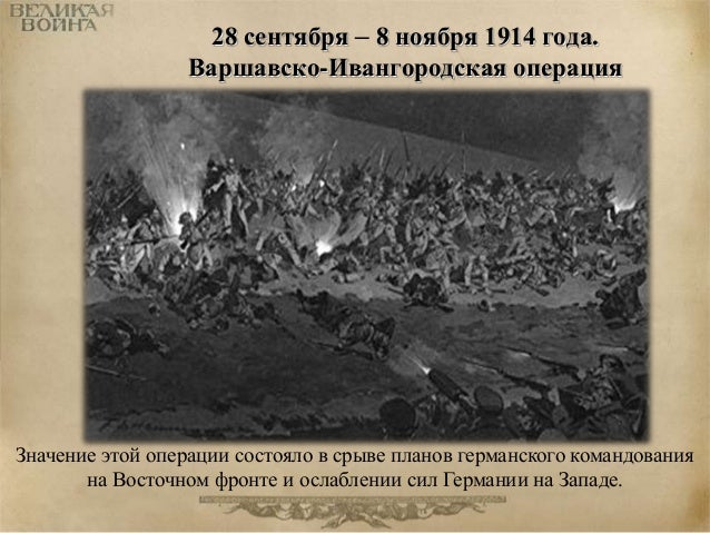 21. 21. 28 сентября – 8 ноября 1914 года. Варшавско-Ивангородская операция Значение этой операции состояло в срыве планов германского командования на Восточном фронте и ослаблении сил Германии на Западе.