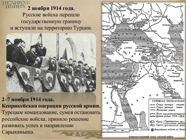 23. 23. 2 ноября 1914 года. Русские войска перешли государственную границу и вступили на территорию Турции. 2–7 ноября 1914 года. Кеприкейская операция русской армии. Турецкое командование, сумев остановить российские войска, приняло решение развивать успех в направлении Сарыкамыша.