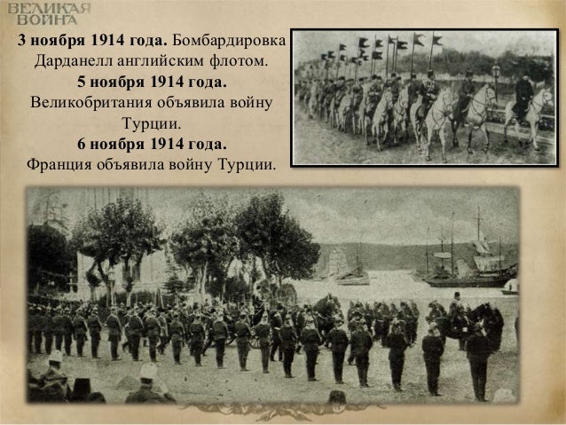 24. 24. 3 ноября 1914 года. Бомбардировка Дарданелл английским флотом. 5 ноября 1914 года. Великобритания объявила войну Турции. 6 ноября 1914 года. Франция объявила войну Турции.