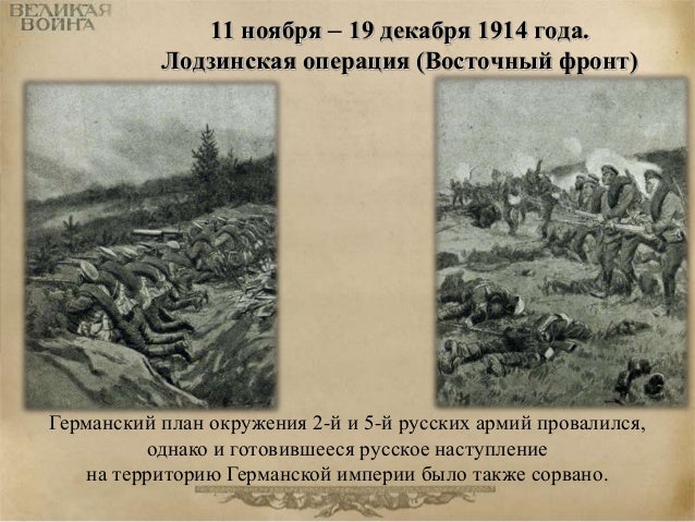 26. 26. 11 ноября – 19 декабря 1914 года. Лодзинская операция (Восточный фронт) Германский план окружения 2-й и 5-й русских армий провалился, однако и готовившееся русское наступление на территорию Германской империи было также сорвано.