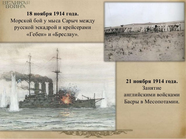 27. 27. 18 ноября 1914 года. Морской бой у мыса Сарыч между русской эскадрой и крейсерами «Гебен» и «Бреслау». 21 ноября 1914 года. Занятие английскими войсками Басры в Месопотамии.