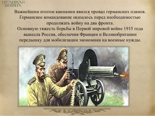 31. 31. Важнейшим итогом кампании явился. провал германских планов. Германское командование оказалось перед необходимостью продолжать войну на два фронта. Основную тяжесть борьбы в Первой мировой войне 1915 года вынесла Россия, обеспечив Франции и Великобритании передышку для мобилизации экономики на военные нужды.