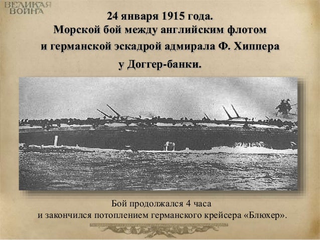 33. 33. 24 января 1915 года. Морской бой между английским флотом и германской эскадрой адмирала Ф. Хиппера у Доггер-банки. Бой продолжался 4 часа и закончился потоплением германского крейсера «Блюхер».