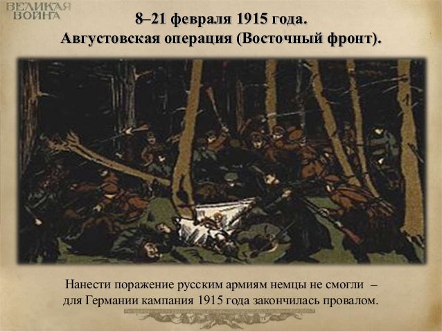 34. 34. 8–21 февраля 1915 года. Августовская операция (Восточный фронт). Нанести поражение русским армиям немцы не смогли – для Германии кампания 1915 года закончилась провалом.