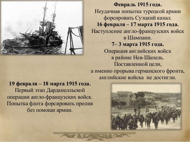 35. 35. Февраль 1915 года. Неудачная попытка турецкой армии форсировать Суэцкий канал. 16 февраля – 17 марта 1915 года. Наступление англо-французских войск в Шампани. 7– 3 марта 1915 года. Операция английских войск в районе Нев-Шапель. Поставленной цели, а именно прорыва германского фронта, английские войска не достигли. 19 февраля – 18 марта 1915 года. Первый этап Дарданелльской операции англо-французских войск. Попытка флота форсировать пролив без помощи армии.