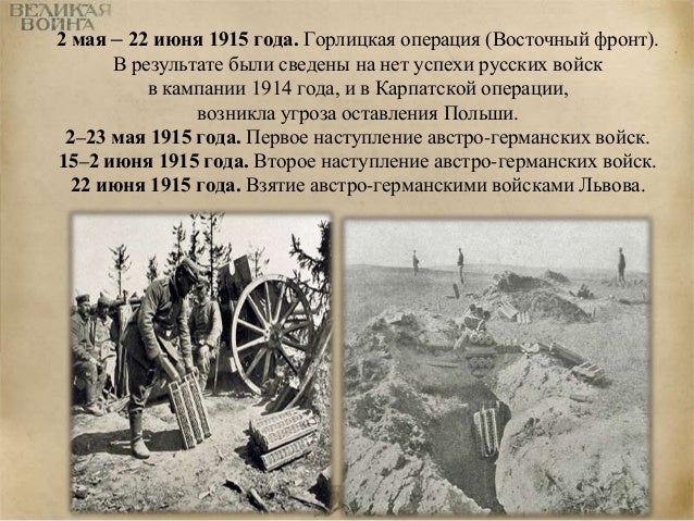 38. 38. 2 мая – 22 июня 1915 года. Горлицкая операция (Восточный фронт). В результате были сведены на нет успехи русских войск в кампании 1914 года, и в Карпатской операции, возникла угроза оставления Польши. 2–23 мая 1915 года. Первое наступление австро-германских войск. 15–2 июня 1915 года. Второе наступление австро-германских войск. 22 июня 1915 года. Взятие австро-германскими войсками Львова.