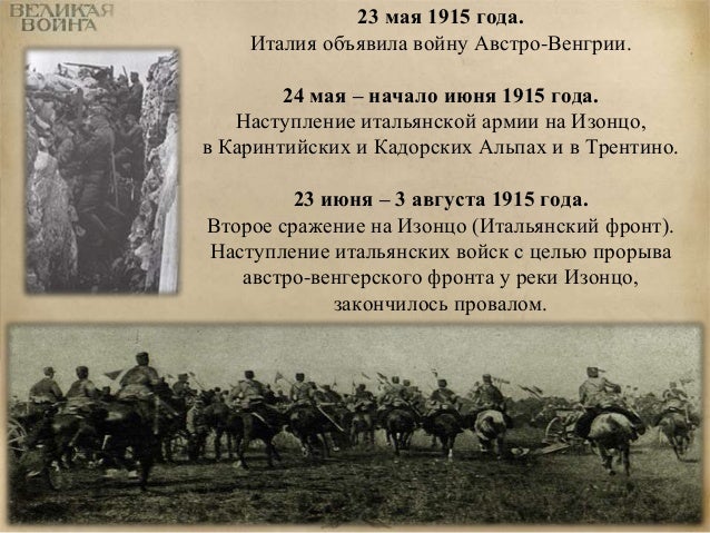 41. 41. 23 мая 1915 года. Италия объявила войну Австро-Венгрии. 24 мая – начало июня 1915 года. Наступление итальянской армии на Изонцо, в Каринтийских и Кадорских Альпах и в Трентино. 23 июня – 3 августа 1915 года. Второе сражение на Изонцо (Итальянский фронт). Наступление итальянских войск с целью прорыва австро-венгерского фронта у реки Изонцо, закончилось провалом.