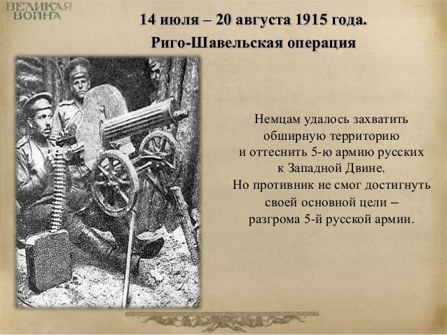 44. 44. 14 июля – 20 августа 1915 года. Риго-Шавельская операция Немцам удалось захватить обширную территорию и оттеснить 5-ю армию русских к Западной Двине. Но противник не смог достигнуть своей основной цели – разгрома 5-й русской армии.