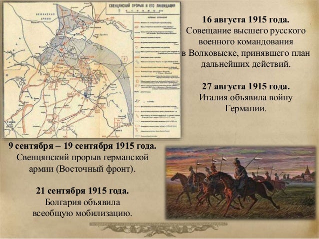 46. 46. 16 августа 1915 года. Совещание высшего русского военного командования в Волковыске, принявшего план дальнейших действий. 27 августа 1915 года. Италия объявила войну Германии. 9 сентября – 19 сентября 1915 года. Свенцянский прорыв германской армии (Восточный фронт). 21 сентября 1915 года. Болгария объявила всеобщую мобилизацию.
