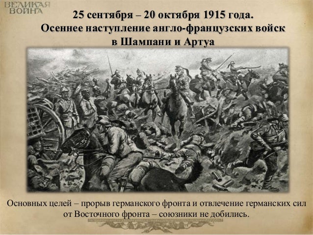 47. 47. 25 сентября – 20 октября 1915 года. Осеннее наступление англо-французских войск в Шампани и Артуа Основных целей – прорыв германского фронта и отвлечение германских сил от Восточного фронта – союзники не добились.