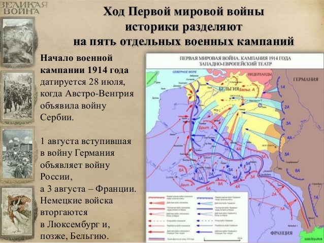 5. 5. Ход Первой мировой войны историки разделяют на пять отдельных военных кампаний Начало военной кампании 1914 года датируется 28 июля, когда Австро-Венгрия объявила войну Сербии. 1 августа вступившая в войну Германия объявляет войну России, а 3 августа – Франции. Немецкие войска вторгаются в Люксембург и, позже, Бельгию.
