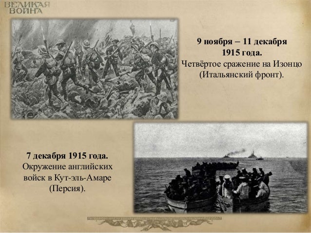 52. 52. 9 ноября – 11 декабря 1915 года. Четвёртое сражение на Изонцо (Итальянский фронт). 7 декабря 1915 года. Окружение английских войск в Кут-эль-Амаре (Персия).