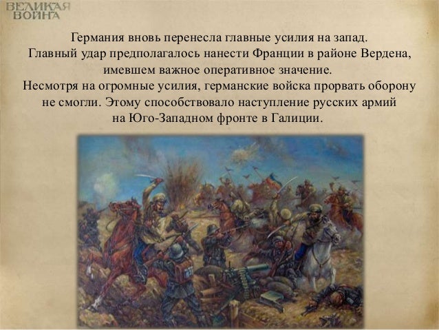 54. 54. Германия вновь перенесла главные усилия на запад. Главный удар предполагалось нанести Франции в районе Вердена, имевшем важное оперативное значение. Несмотря на огромные усилия, германские войска прорвать оборону не смогли. Этому способствовало наступление русских армий на Юго-Западном фронте в Галиции.