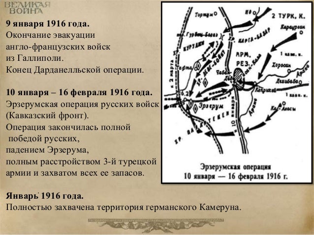 55. 55. 9 января 1916 года. Окончание эвакуации англо-французских войск из Галлиполи. Конец Дарданелльской операции. 10 января – 16 февраля 1916 года. Эрзерумская операция русских войск (Кавказский фронт). Операция закончилась полной победой русских, падением Эрзерума, полным расстройством 3-й турецкой армии и захватом всех ее запасов. . Январь 1916 года. Полностью захвачена территория германского Камеруна.