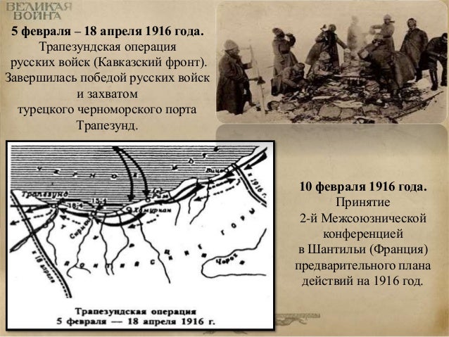 56. 56. 5 февраля – 18 апреля 1916 года. Трапезундская операция русских войск (Кавказский фронт). Завершилась победой русских войск и захватом турецкого черноморского порта Трапезунд. 10 февраля 1916 года. Принятие 2-й Межсоюзнической конференцией в Шантильи (Франция) предварительного плана действий на 1916 год.