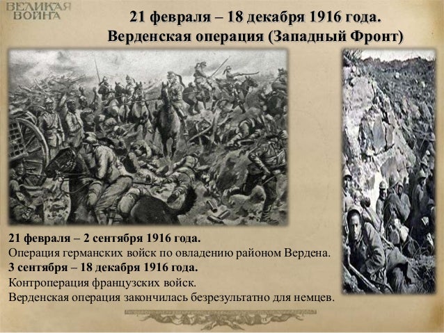 57. 57. 21 февраля – 18 декабря 1916 года. Верденская операция (Западный Фронт) 21 февраля – 2 сентября 1916 года. Операция германских войск по овладению районом Вердена. 3 сентября – 18 декабря 1916 года. Контроперация французских войск. Верденская операция закончилась безрезультатно для немцев.
