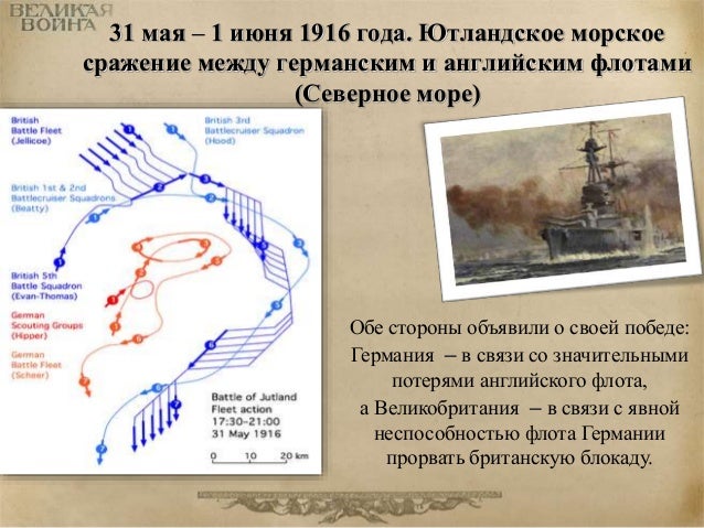 60. 60. 31 мая – 1 июня 1916 года. Ютландское морское сражение между германским и английским флотами (Северное море) Обе стороны объявили о своей победе: Германия – в связи со значительными потерями английского флота, а Великобритания – в связи с явной неспособностью флота Германии прорвать британскую блокаду.